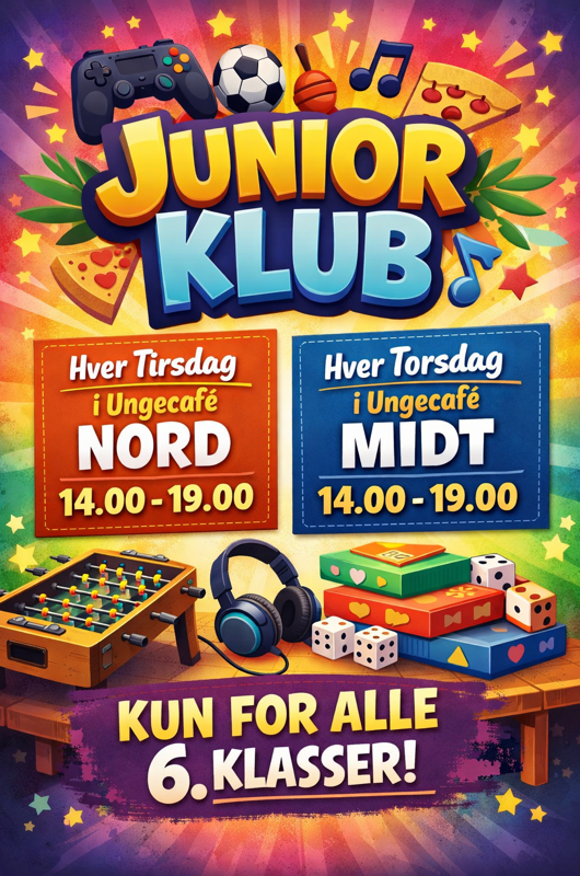 Hver tirsdag i Café Nord og torsdag i Café Midt er der juniorklub kun for 6. klasserne. Her er der fællesspisning, masser af fede aktiviteter, spil, hygge og mulighed for at være sammen med vennerne. Kom og vær med til nogle sjove aftener med god stemning og fællesskab.